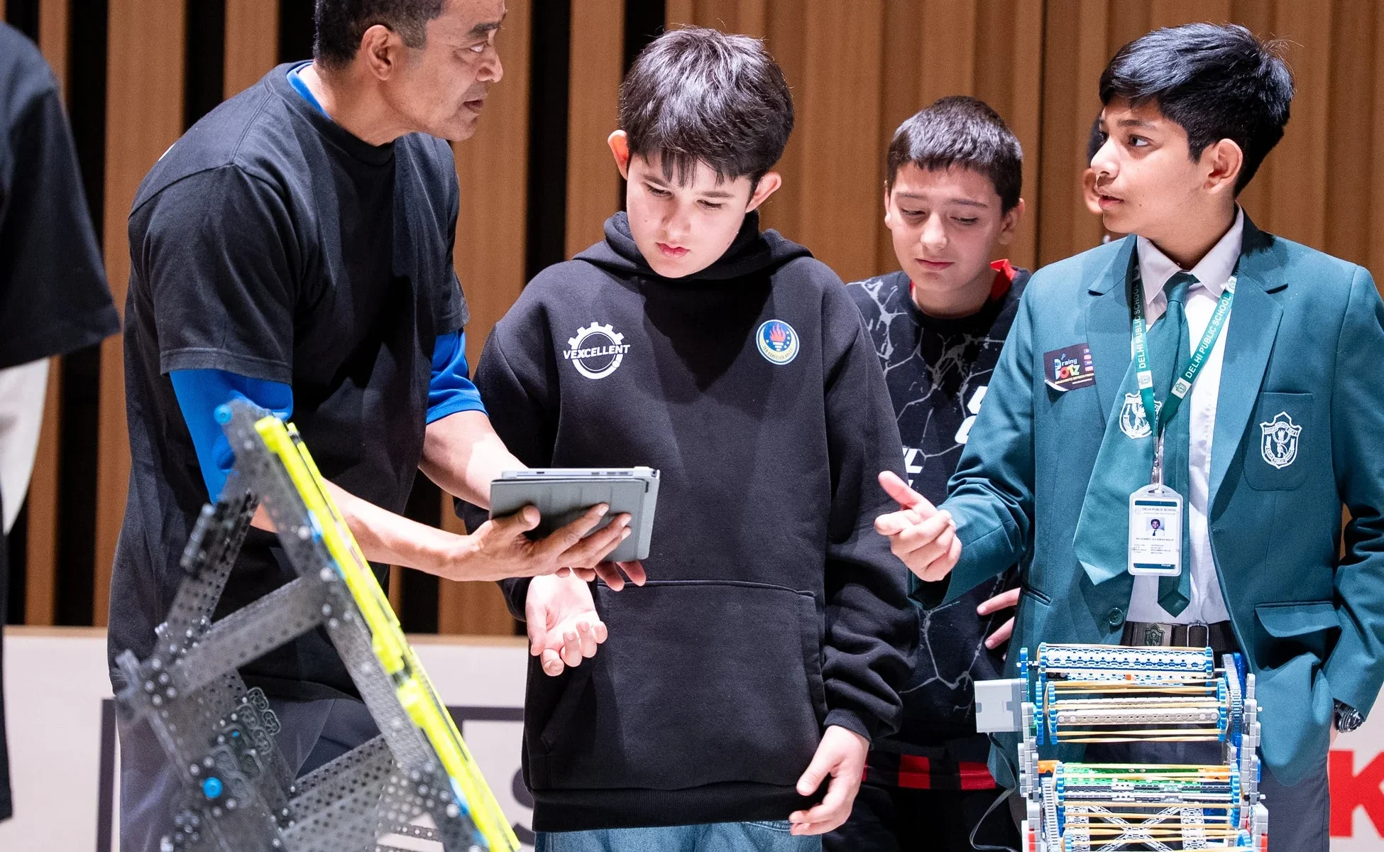VEX Robotics Competitionでは、試合ごとに他のチームと「アライアンス(協力チーム)」を組んで、共通のミッションに挑戦するんだ。国籍や年齢、性別の違うチーム同士がその場で戦略を共有し、協力し合って課題を解決していく様子は、まさに多様な学びの場。 -
