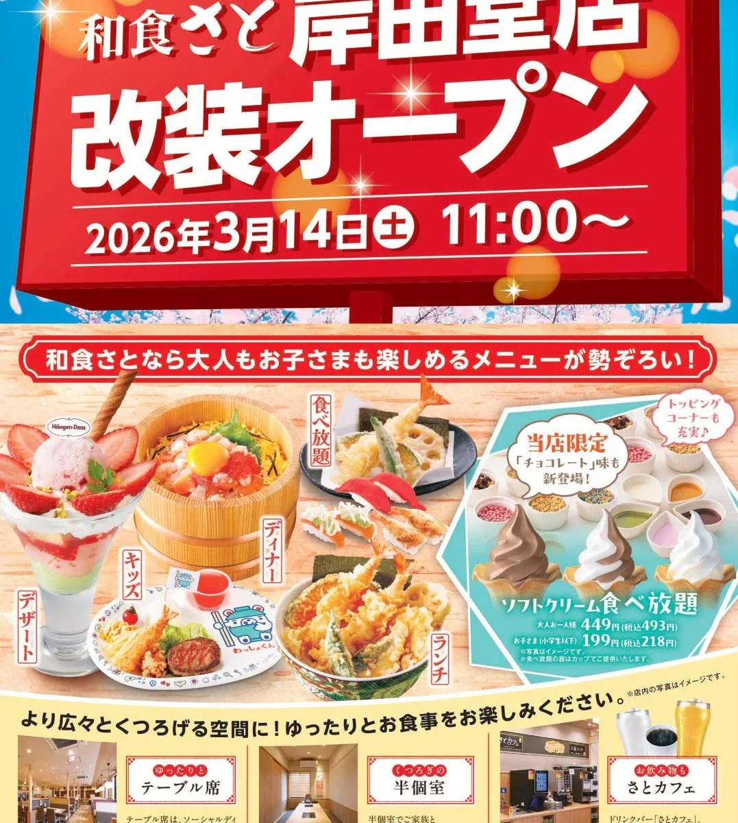 「和食さと 岸田堂店」が、2026年3月14日(土)午前11時にリニューアルオープンします!家族や友達と、もっと楽しく、もっとゆったりと過ごせる空間に生まれ変わるようですよ。