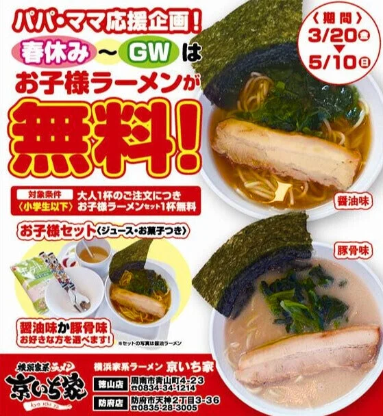 物価高騰が続く中、外食はちょっと贅沢に感じることもありますよね。そんな子育て世帯に嬉しいニュースが届きました!横浜家系ラーメン「京いち家」が、春休みからゴールデンウィークにかけて、お子様ラーメン無料キャンペーンを実施します。