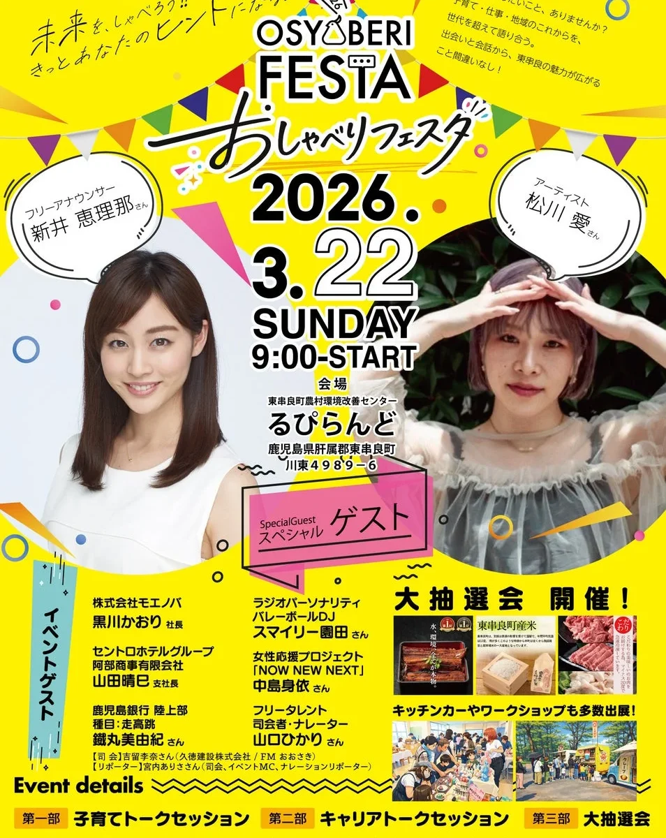 スペシャルゲストには、フリーアナウンサーの新井恵理那さんとアーティストの松川愛さんが登場!幅広い世代から支持されるお二人の話は、子育て世代にとってきっと心強いエールとなるはずです。さらに、大隅半島エリアで活躍中の宮内ありささんもリポーターとして緊急参加し、会場全体を盛り上げてくれます。
