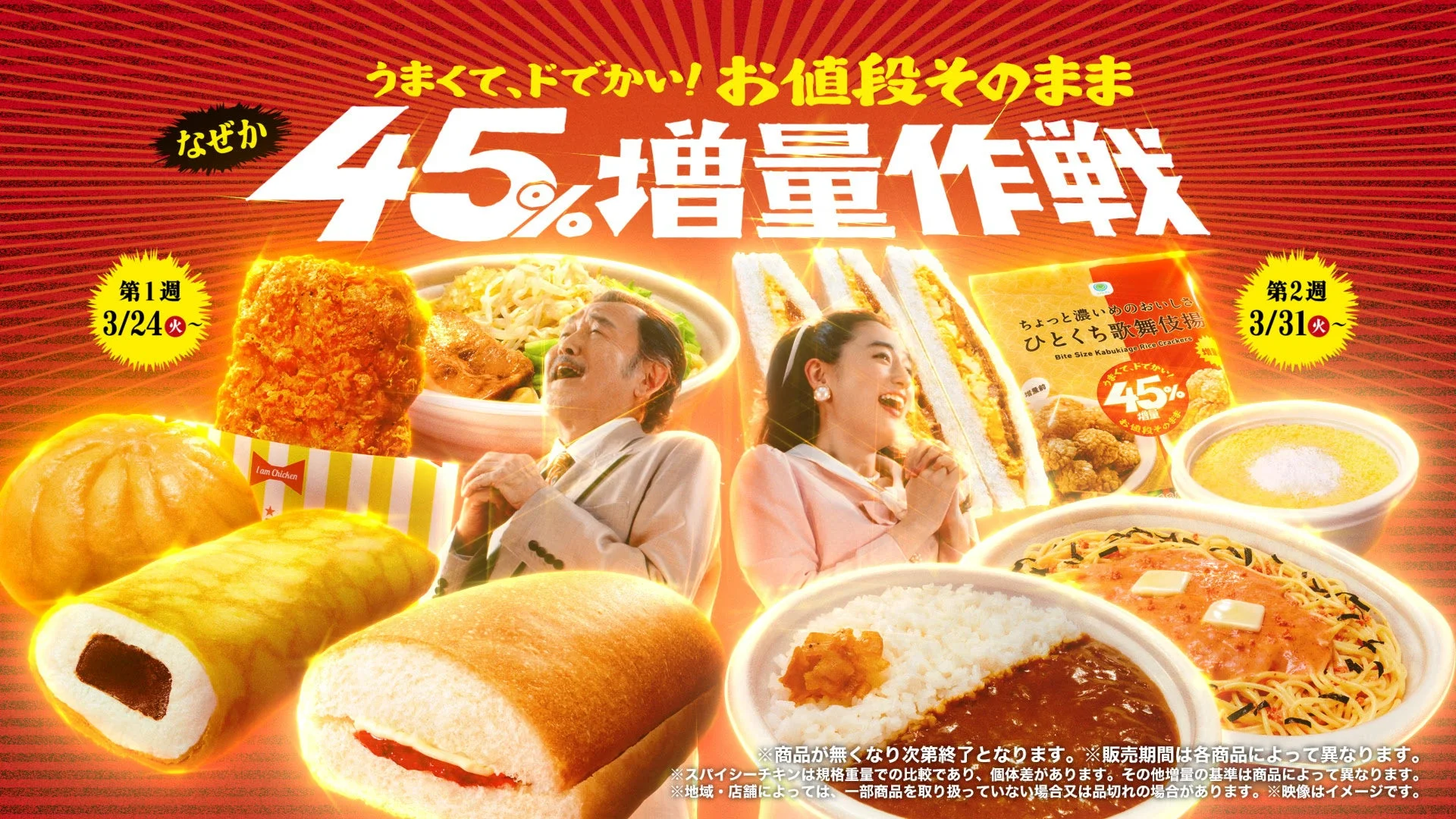 このキャンペーンでは、人気商品がお値段そのままに“なぜか45%”増量されて登場します。春の開催に合わせて、生コッペパンや中華まん、ラーメンなど、バラエティ豊かな全14種類が週替わりでラインアップされます。増量商品はなくなり次第終了となるため、気になる商品は早めにチェックするのがおすすめです。