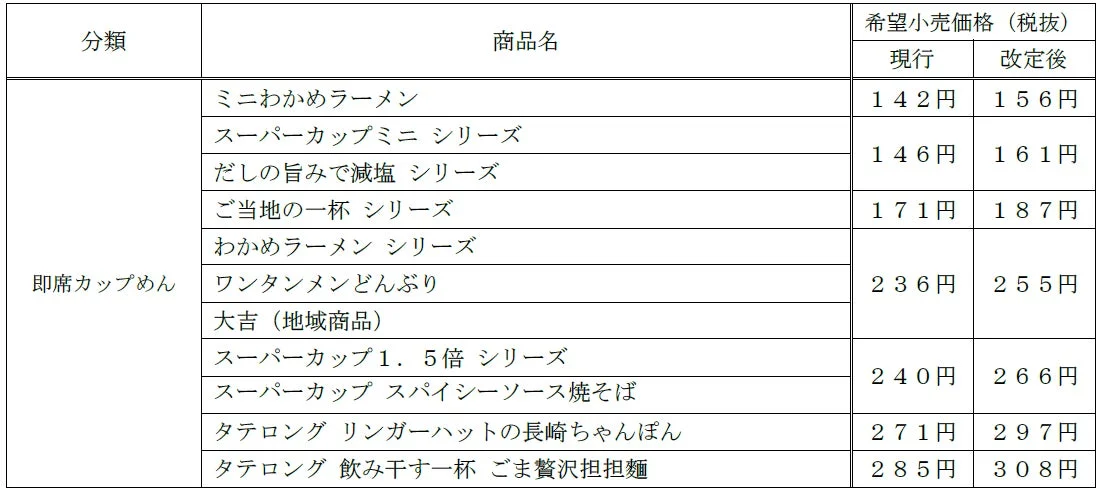 上記画像に掲載されている「ミニわかめラーメン」「スーパーカップミニ シリーズ」「だしの旨みで減塩 シリーズ」「ご当地の一杯 シリーズ」「わかめラーメン シリーズ」「ワンタンメンどんぶり」「スーパーカップ1.5倍 シリーズ」「スーパーカップ スパイシーソース焼そば」「タテロング リンガーハットの長崎ちゃんぽん」「タテロング 飲み干す一杯 ごま贅沢担担麺」などが価格改定の対象となります。