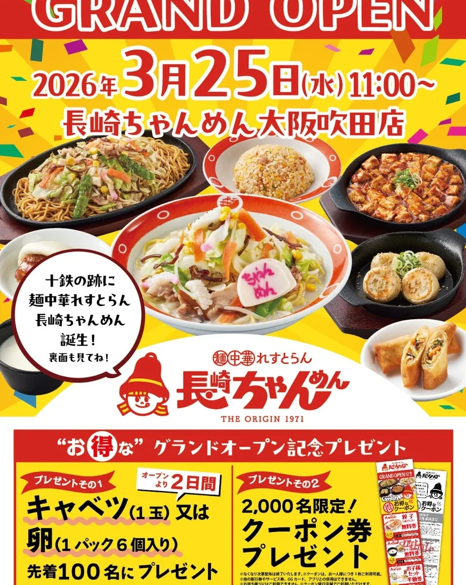 2026年3月25日(水)、旧「長崎ちゃんぽん十鉄」の跡地に「長崎ちゃんめん」大阪吹田店が「麺中華れすとらん」として新たにグランドオープンします。