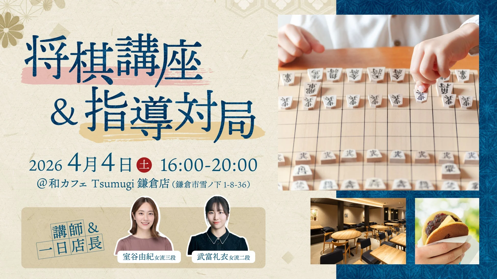 2026年4月4日(土)に、和カフェ Tsumugi 鎌倉店にて「プロ女流棋士に学ぶ!将棋講座 & 指導対局」という特別なイベントが開催されます!このイベントは、室谷由紀 女流三段と武富礼衣 女流二段というプロの女流棋士を講師に迎え、将棋の楽しさをたっぷり味わえる体験型イベントです。