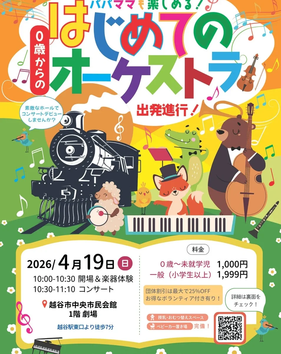 「うちの子にはまだ早いかな?」「泣いちゃったらどうしよう…」そんな心配はもういりません!0歳の赤ちゃんから未就学児、そしてもちろん小学生以上のお子さんから大人まで、家族みんなで楽しめる大人気の「0歳からの・はじめてのオーケストラ」が、2026年4月19日(日)に越谷市中央市民会館にやってきます。