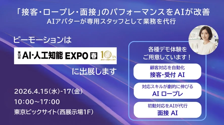 2026年4月15日(水)から17日(金)まで東京ビッグサイトで開催される「NexTech Week 2026【春】」(第10回 AI・人工知能 EXPO)に、ビーモーション株式会社が出展します。