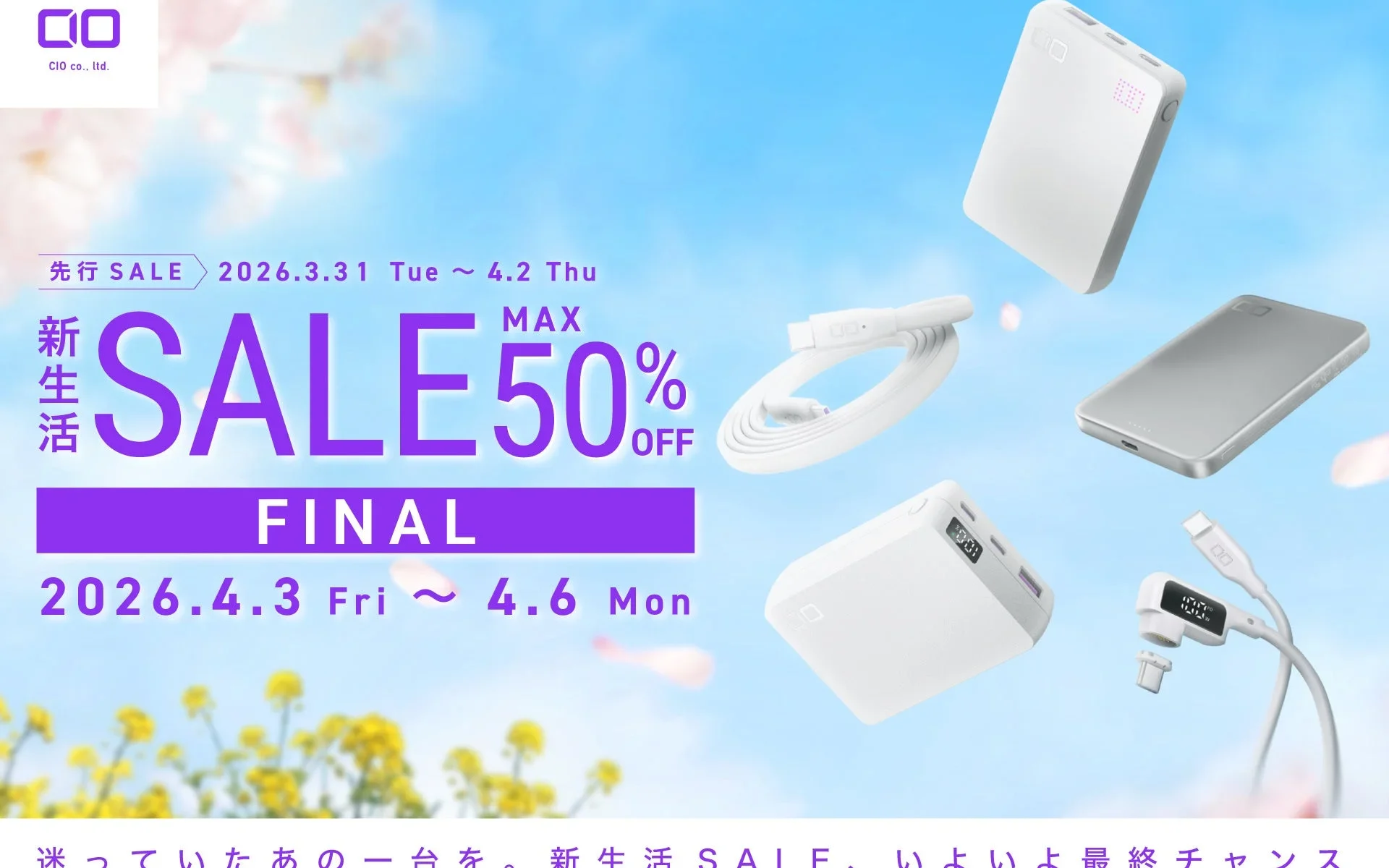 日本発のガジェットメーカー、株式会社CIOがAmazonで開催される「新生活セール Final」に参加するよ!今回のセールでは、最新のスマホやPC充電に最適なガジェットが最大50%OFF(※1)になるんだって。新生活に向けて充電環境を整えたい人は見逃せないね!