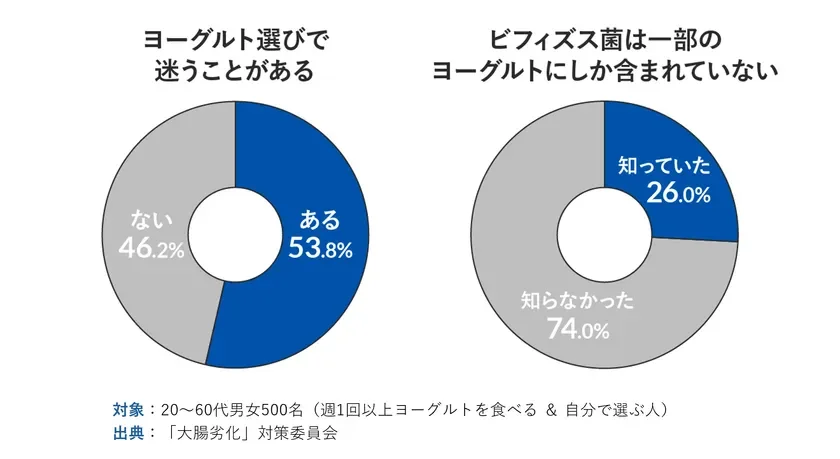 スーパーのヨーグルト売り場、種類が多すぎてどれを選べばいいか迷っちゃいますよね。「なんとなく健康に良さそうだから」と手に取っている人も多いかもしれません。実際、ある調査では、健康を意識してヨーグルトを食べている人が約8割にものぼる一方で、53.8%の人が「選ぶ際に迷うことがある」と答えているそうです。さらに、ヨーグルトに含まれる菌に関する知識が不足している人も多く、ビフィズス菌について74.0%の人が誤解しているというデータもあります。