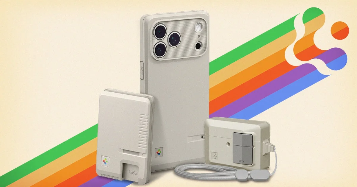 懐かしのMacintoshをオマージュしたiPhone 17 Proケースも登場しました。柔らかいベージュカラーに虹色のロゴ、そして「hello」の刻印ボタンなど、原作へのリスペクトがたっぷり詰まったデザインです。フロッピーディスクドライブを想像させるストラップホルダーに、お気に入りのストラップを付けてカスタマイズも楽しめます。もちろんMagSafe対応のマグネットも内蔵しているので、クラシックな見た目だけでなく、便利さもバッチリです。