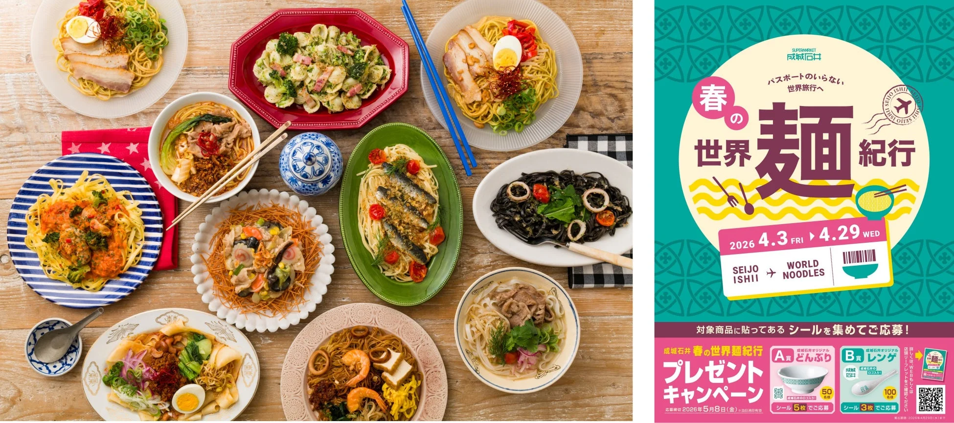 2026年4月3日(金)から4月29日(水)まで、成城石井の全228店舗で「成城石井 春の世界麺紀行」フェアが開催されます。このフェアでは、「食卓で楽しむ世界旅行」をテーマに、セントラルキッチンで働くプロの料理人たちが手がけた世界の麺料理が勢ぞろいします。