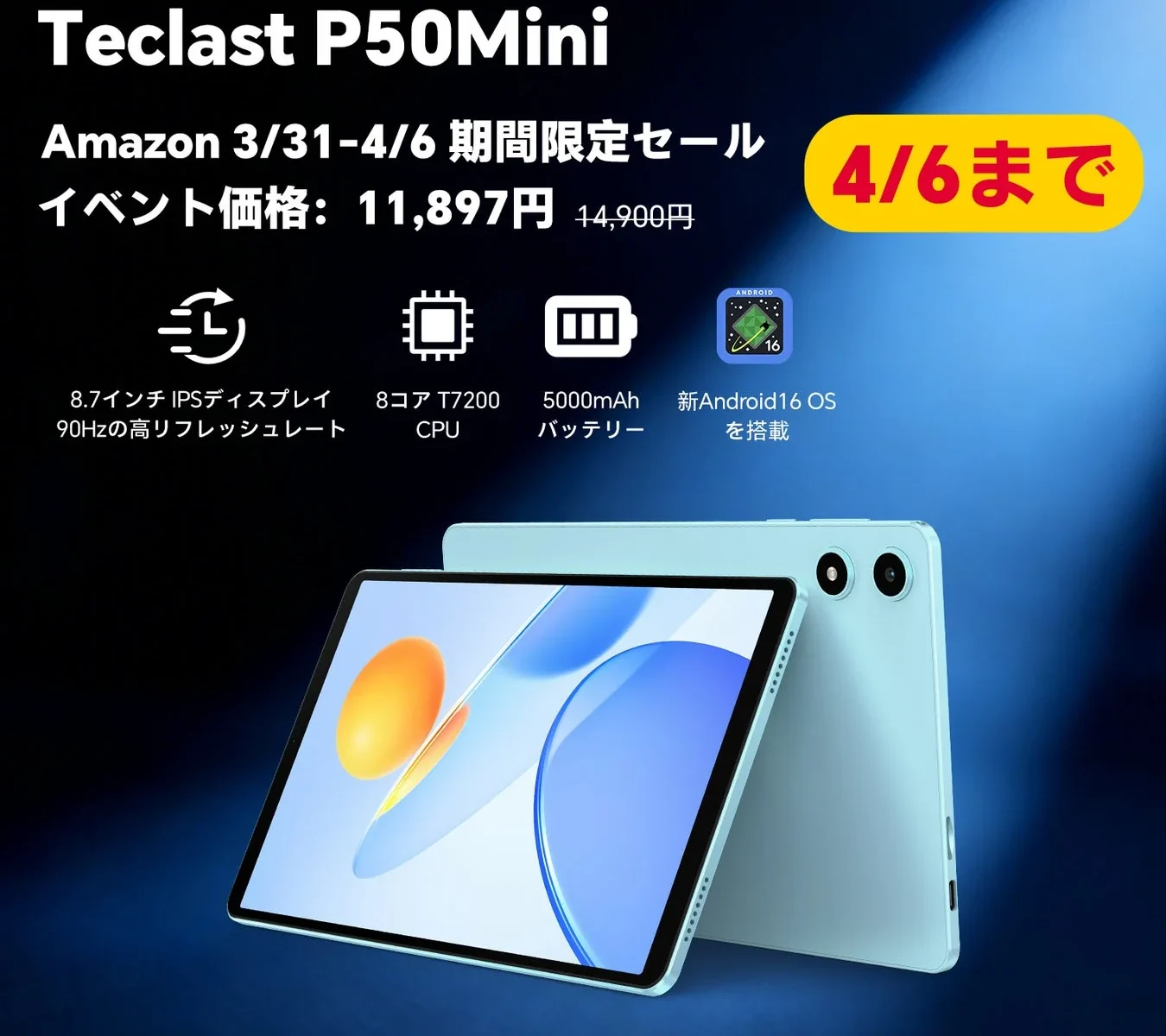 タブレットメーカーのTeclastが手がける8.7インチAndroidタブレット「Teclast P50Mini」が、Amazonでとってもお得なセール価格で登場しています! 2026年3月31日から4月6日までの期間中、通常価格14,900円(税込)から20%OFFとなる11,897円(税込)で購入できますよ。