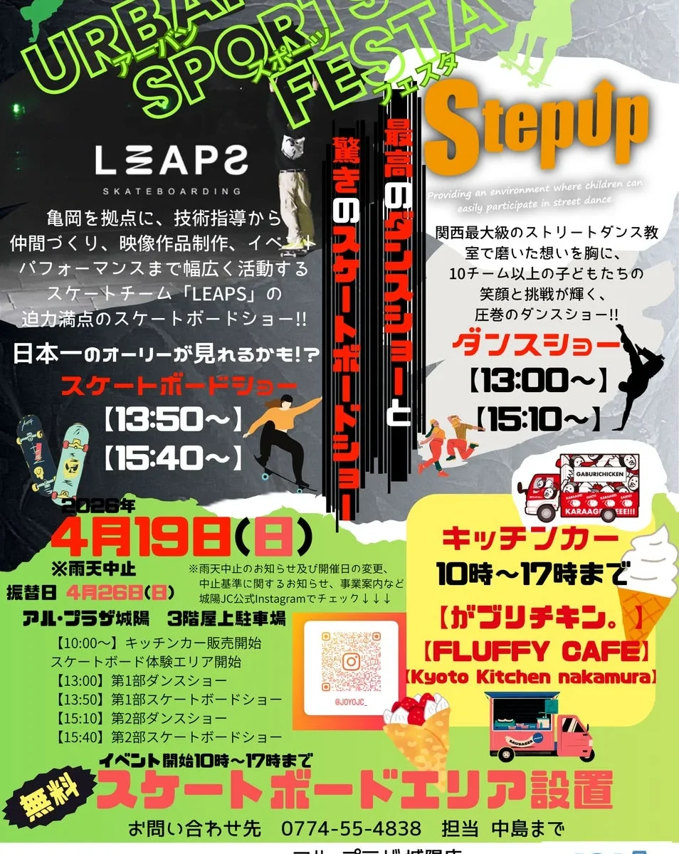 2026年4月19日(日)に、京都府城陽市のアル・プラザ城陽 3階屋上駐車場で「アーバンスポーツフェスタ」が開催されます!スケートボードとダンスの迫力あるパフォーマンスはもちろん、無料体験エリアやキッチンカーも登場し、家族みんなで一日中楽しめるイベントですよ。