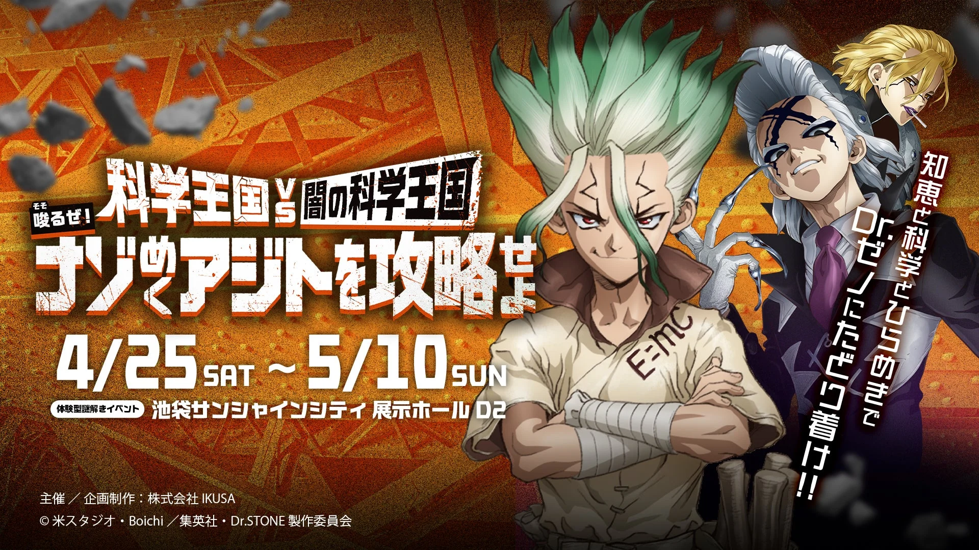 TVアニメ「Dr.STONE」とコラボした体験型謎解きイベント「科学王国 VS 闇の科学王国〜唆るぜ!ナゾめくアジトを攻略せよ〜」が、2026年4月から東京と大阪で順次スタートします!東京公演のチケットはもう販売中ですよ。