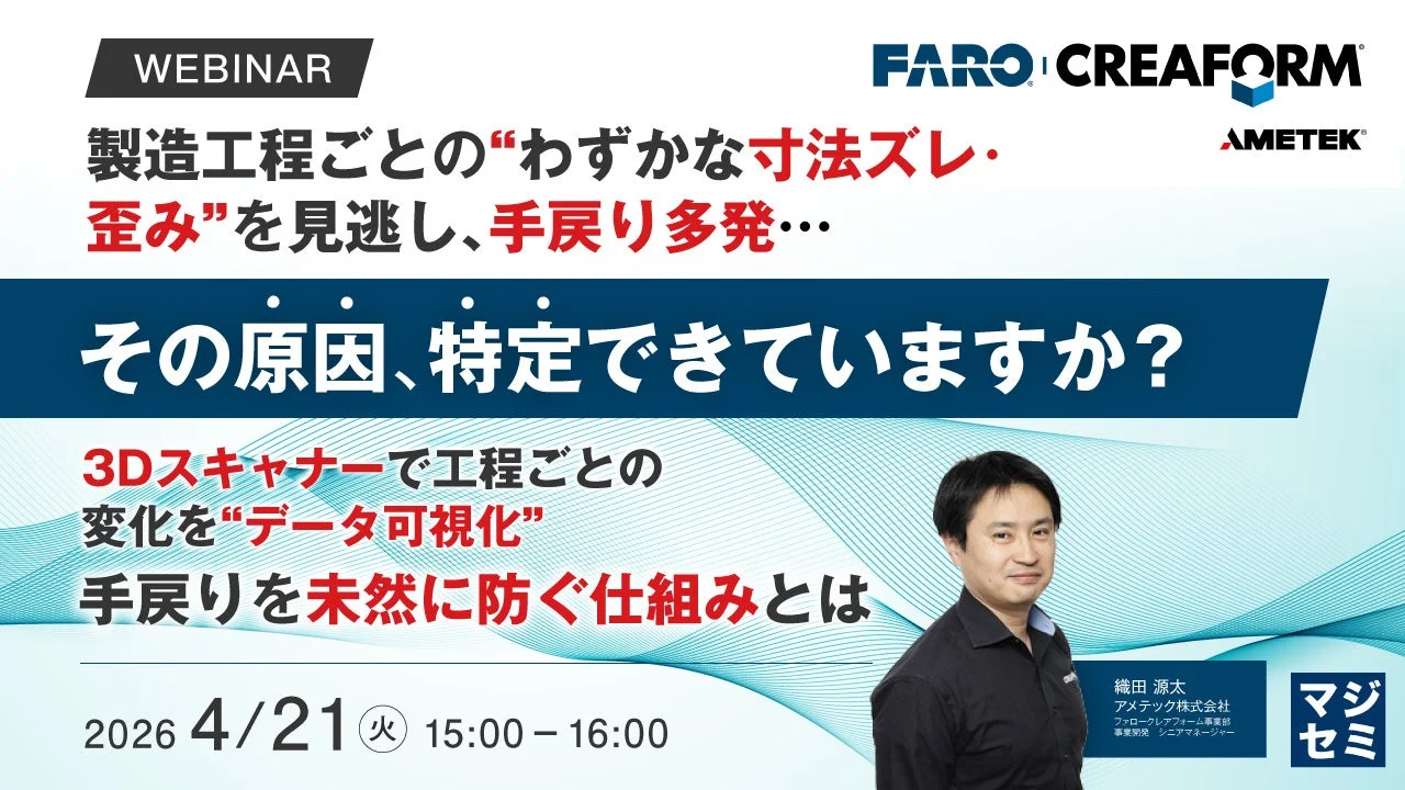 そこで注目したいのが、3Dスキャナーの活用です。このウェビナーでは、3Dスキャナーを使って製造物の形状を高精度にデータ化し、各工程における変化をバッチリ可視化する手法を紹介します。