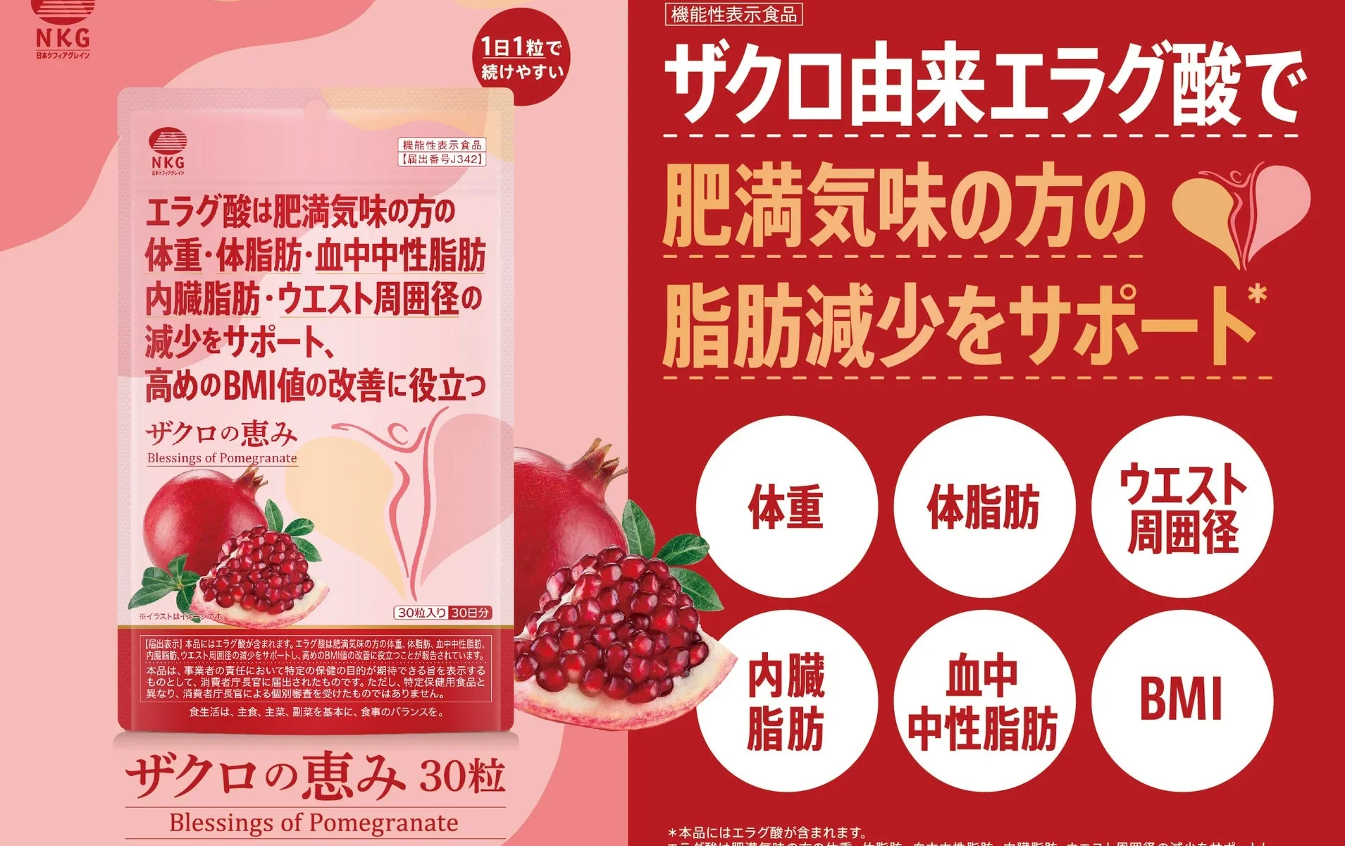 そこで日本ケフィアは、見た目にも影響しやすいウエスト周りなどの改善に役立つ成分に注目しました。女性に人気のザクロの魅力に、機能性表示食品としての信頼性をプラス。お財布にも優しくて、毎日無理なく続けられる「ザクロの恵み」が誕生しました。