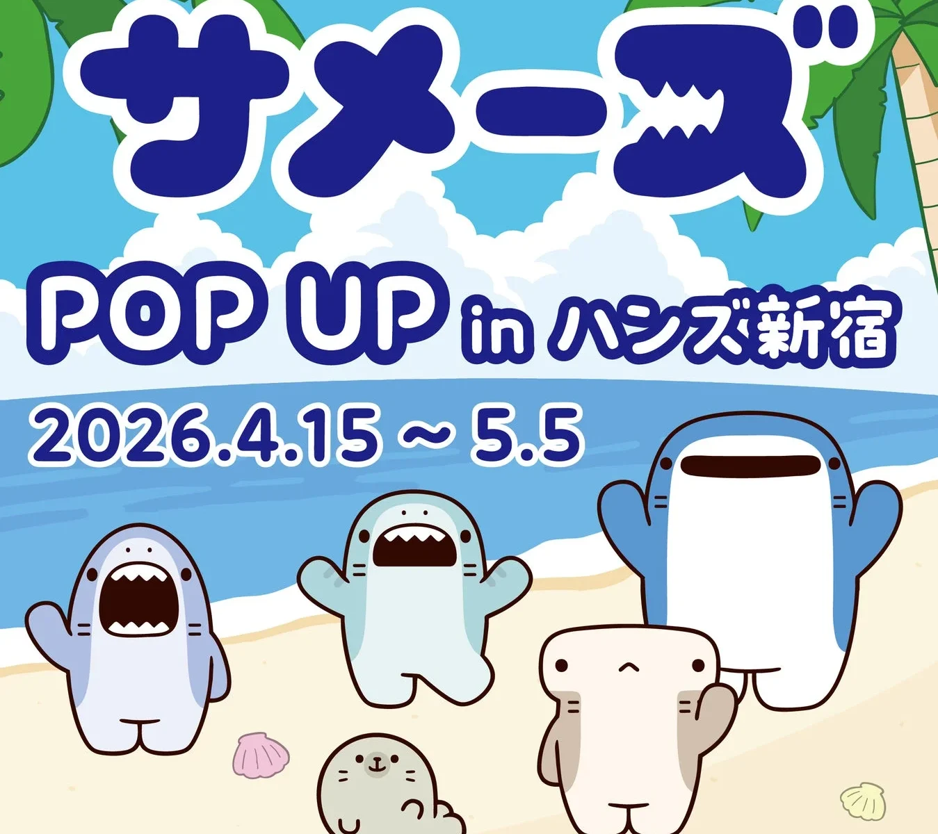 現在開催中の「サメーズPOP UP in ハンズ新宿」は、2026年4月15日(水)から5月5日(火)までの期間限定イベントです。ハンズ新宿店5Fのバラエティフロアで、サメーズのかわいいグッズがたくさん登場しています。