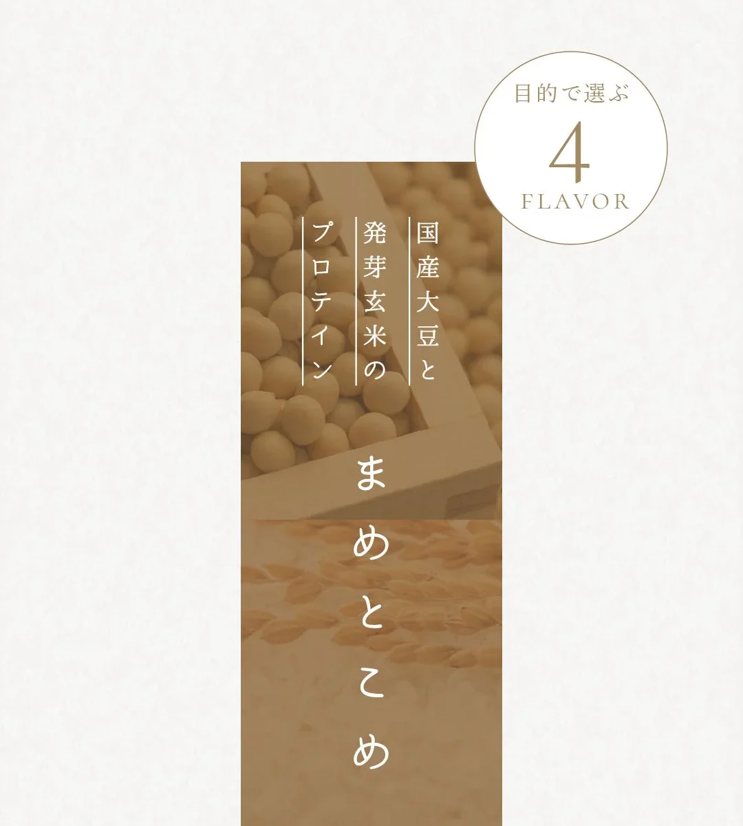 このプロテインは、「鍛える」ことよりも「整える」ことに着目。現代女性が抱えがちな「栄養の偏り」「ホルモンバランス」「腸内環境」という3つの課題に寄り添うことを目指して開発されました。日本に古くからなじみのある「豆」と「米」をベースに、国産大豆、発芽玄米、さらに和漢植物を組み合わせた、毎日の体調リズムに合わせた4タイプがラインナップされています。もちろん、人工甘味料・香料・保存料は一切使われていません。