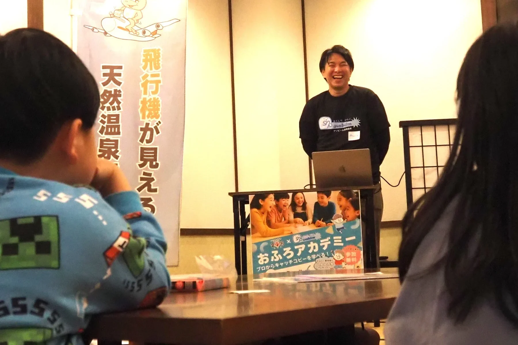 このイベントでは、全国でも珍しい「飛行機が見える露天風呂」が人気の「天然温泉こまき楽の湯」を舞台に、子どもたちが施設の魅力を再発見し、「どうしたらもっと来たくなる?」という視点でキャッチコピーを考案しました。