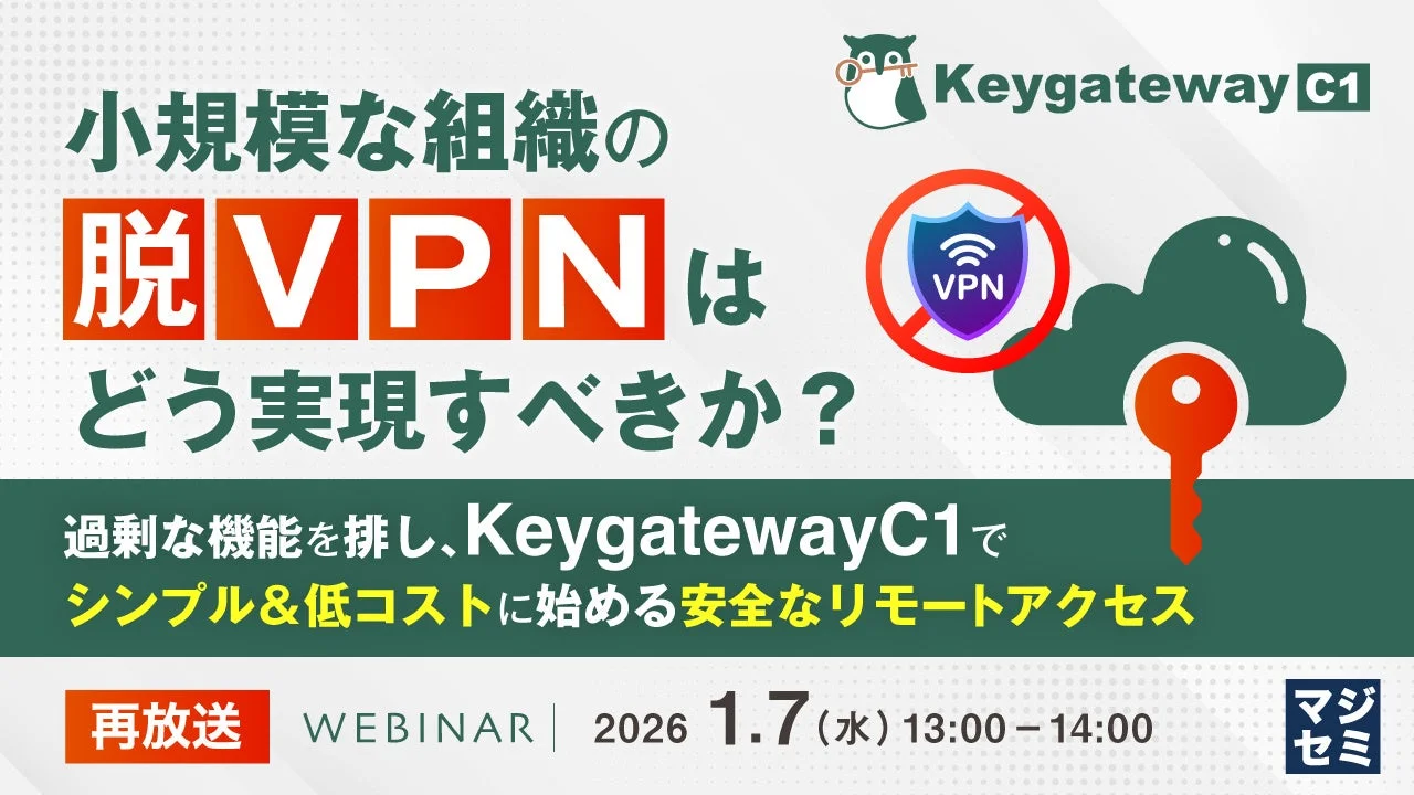 今回のウェビナーでは、中小企業で「KeygatewayC1」を導入し、VPNに代わるセキュアな接続環境を実現した事例が紹介されます。過剰な機能を省き、必要十分な機能に絞ることで、圧倒的に低いコストで無理なく「脱VPN」を始められる現実的な解決策が学べます。