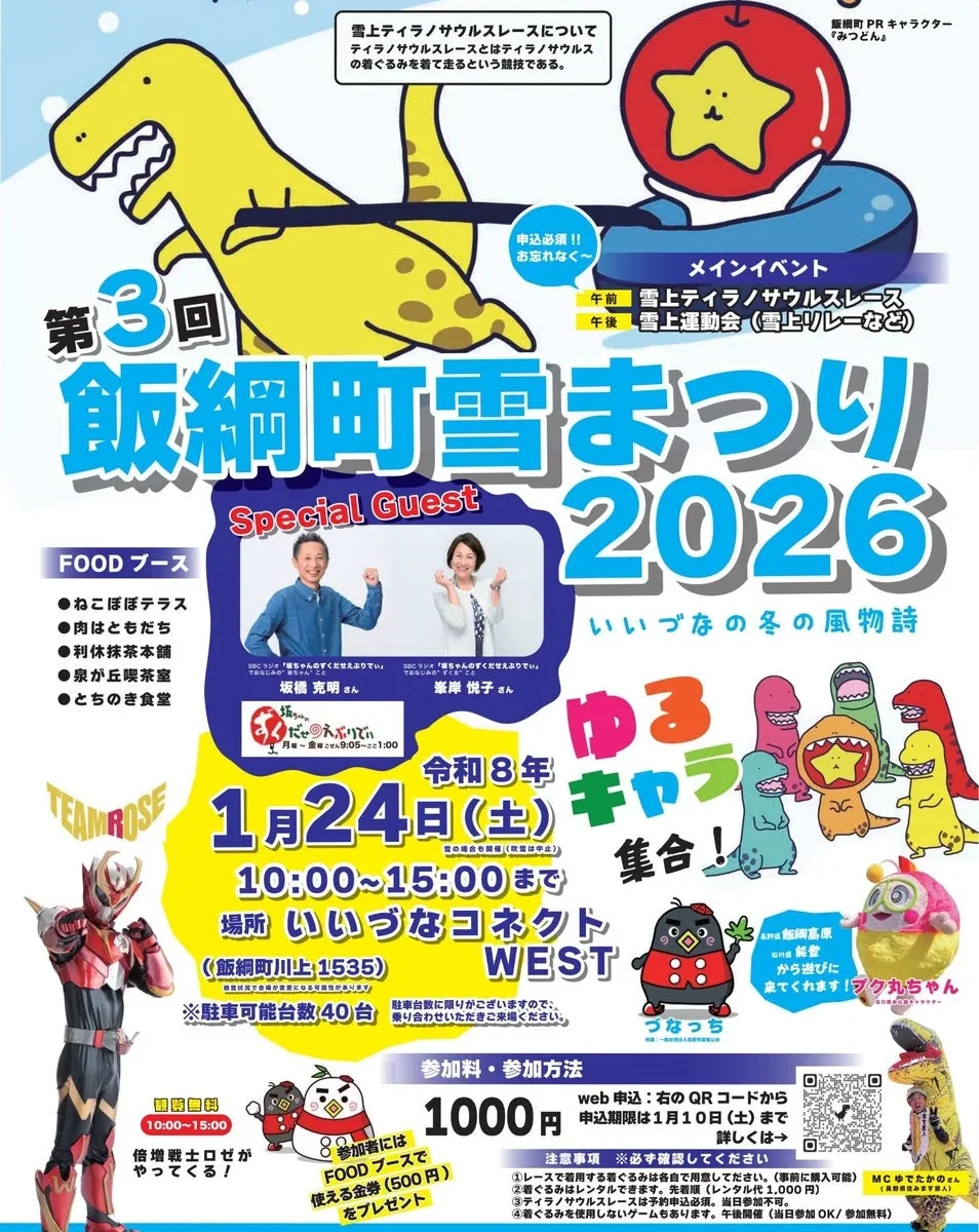 長野県飯綱町で、冬のビッグイベント「飯綱町雪まつり2026」が開催されます!今年の目玉は、なんといっても大人気の「雪上ティラノサウルスレース」。恐竜たちが雪原を駆け巡るユニークな光景は、見ているだけでも楽しくなっちゃいますね!
