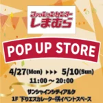 しまむらのPOP UP STOREが池袋サンシャインシティアルタに期間限定オープン!婦人服や子供服が盛りだくさん! 2026年4月16日 しまむらが2026年4月27日から5月10日まで、池袋サンシャインシティアルタに期間限定のPOP UP STOREをオープンします。婦人服や子供服を中心に、人気キャラクターやインフルエンサー企画の商品が並び、キャッシュレス決済で買い物が楽しめます。