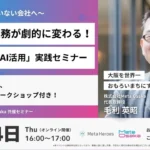 AI未導入企業必見!アナログ業務を激変させる「はじめてのAI活用」実践セミナーが5月14日にオンライン開催! 2026年4月19日 株式会社Meta Heroesと株式会社Meta Osakaが共催で、経営層向けオンラインセミナー「まだAIを使っていない会社へ〜 アナログ業務が劇的に変わる!『はじめてのAI活用』実践セミナー」を2026年5月14日(木)に開催します。AI活用の重要性と実践方法を学べる60分間の無料ウェビナーです。